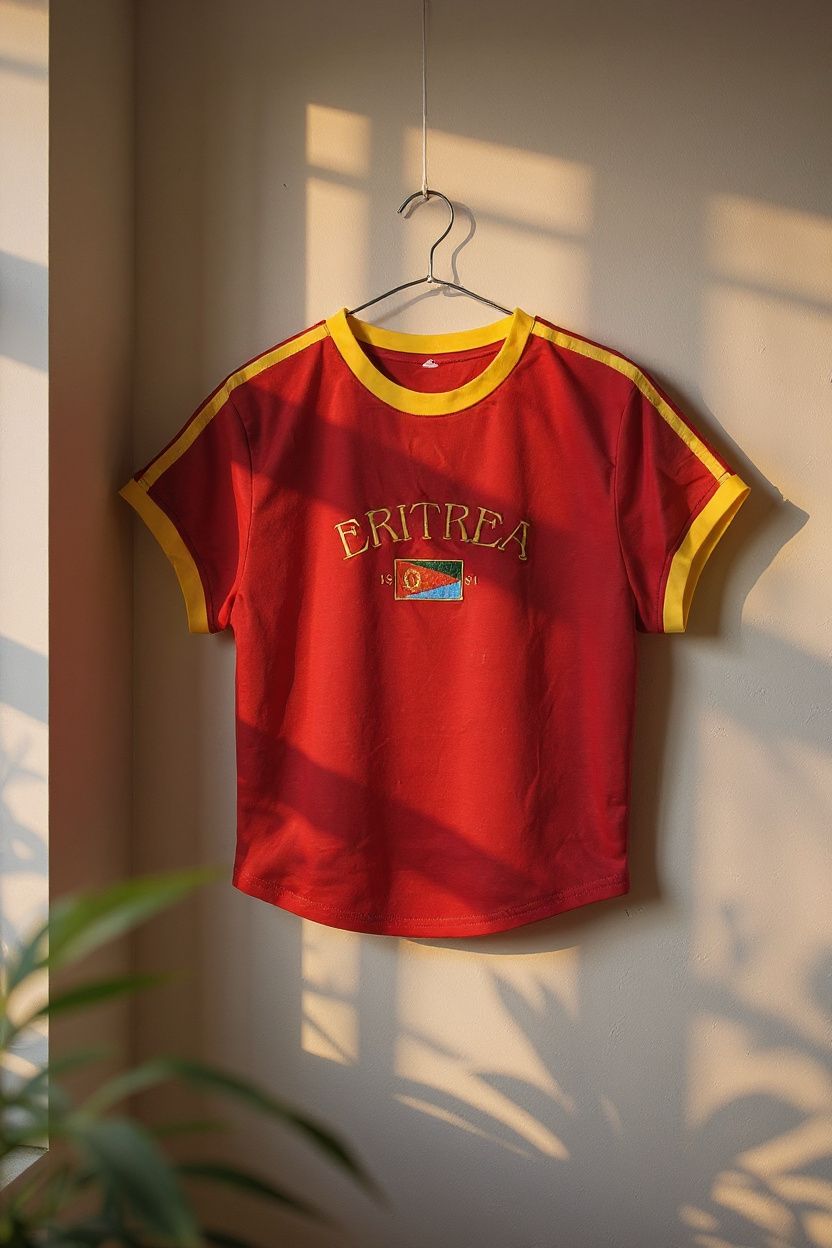 Audacieux et vibrant, ce crop top rouge célèbre la passion et le courage. Réalisé en coton 100 % et brodé avec finesse, il arbore les inscriptions "ERITREA" et "1991" ainsi que le drapeau, symbole de mémoire et de fierté.