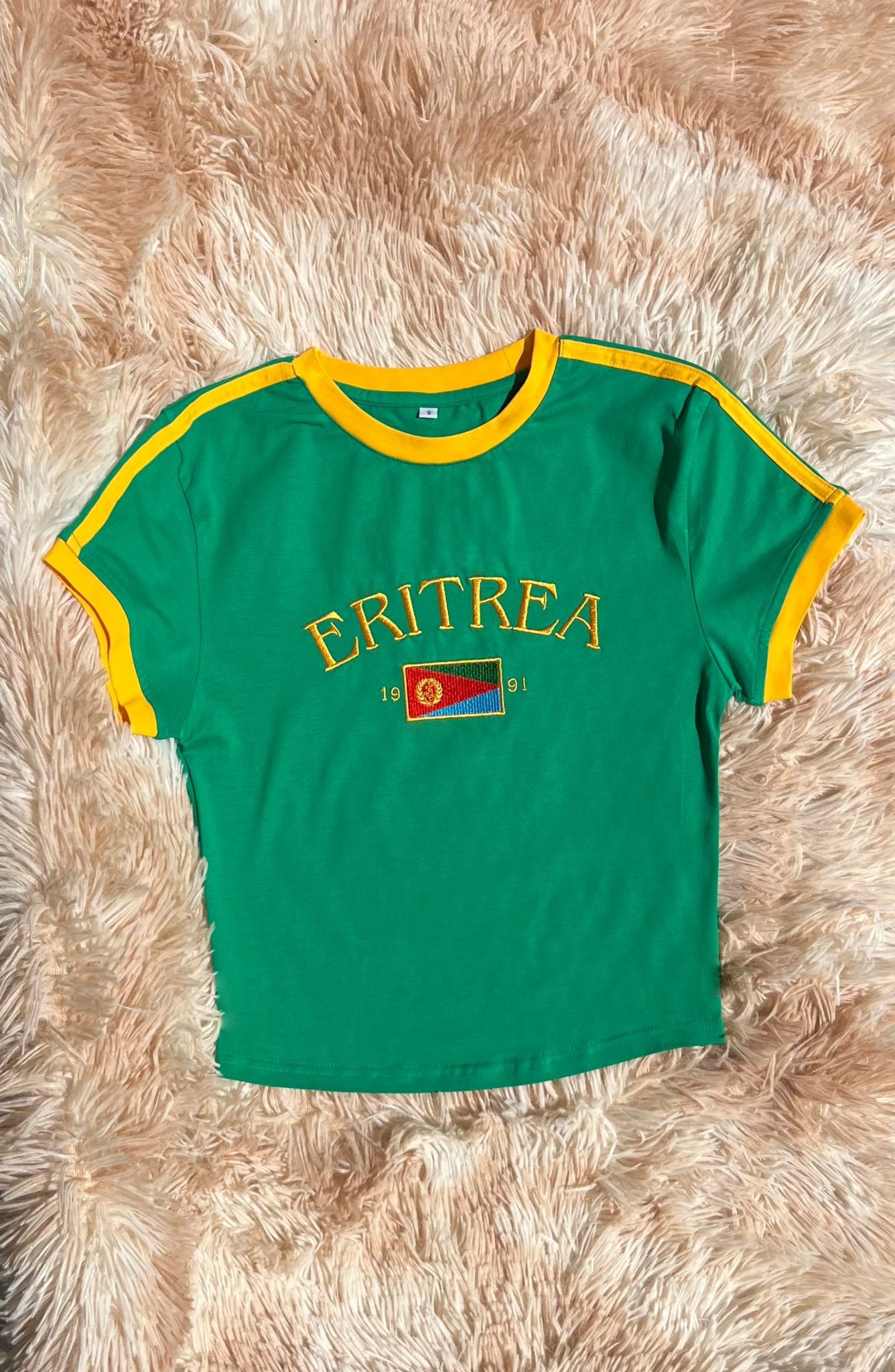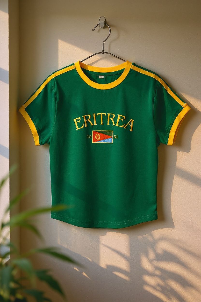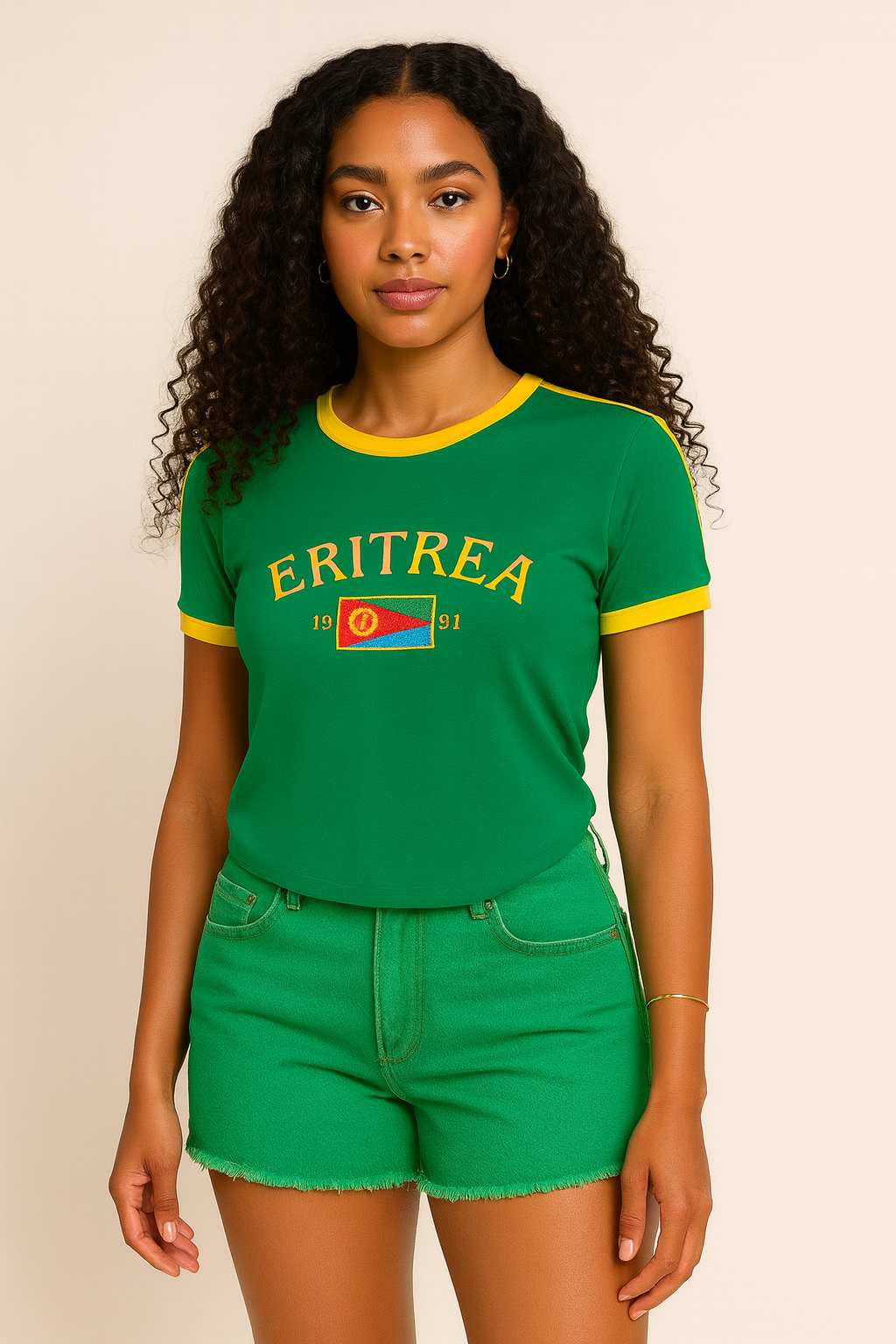 Fraîcheur, vitalité et authenticité : ce crop top vert "ERITREA" est un hommage à la terre, à la prospérité et à la richesse de nos racines. Conçu en coton 100 %, avec broderies soignées, il allie confort et symbolique forte.