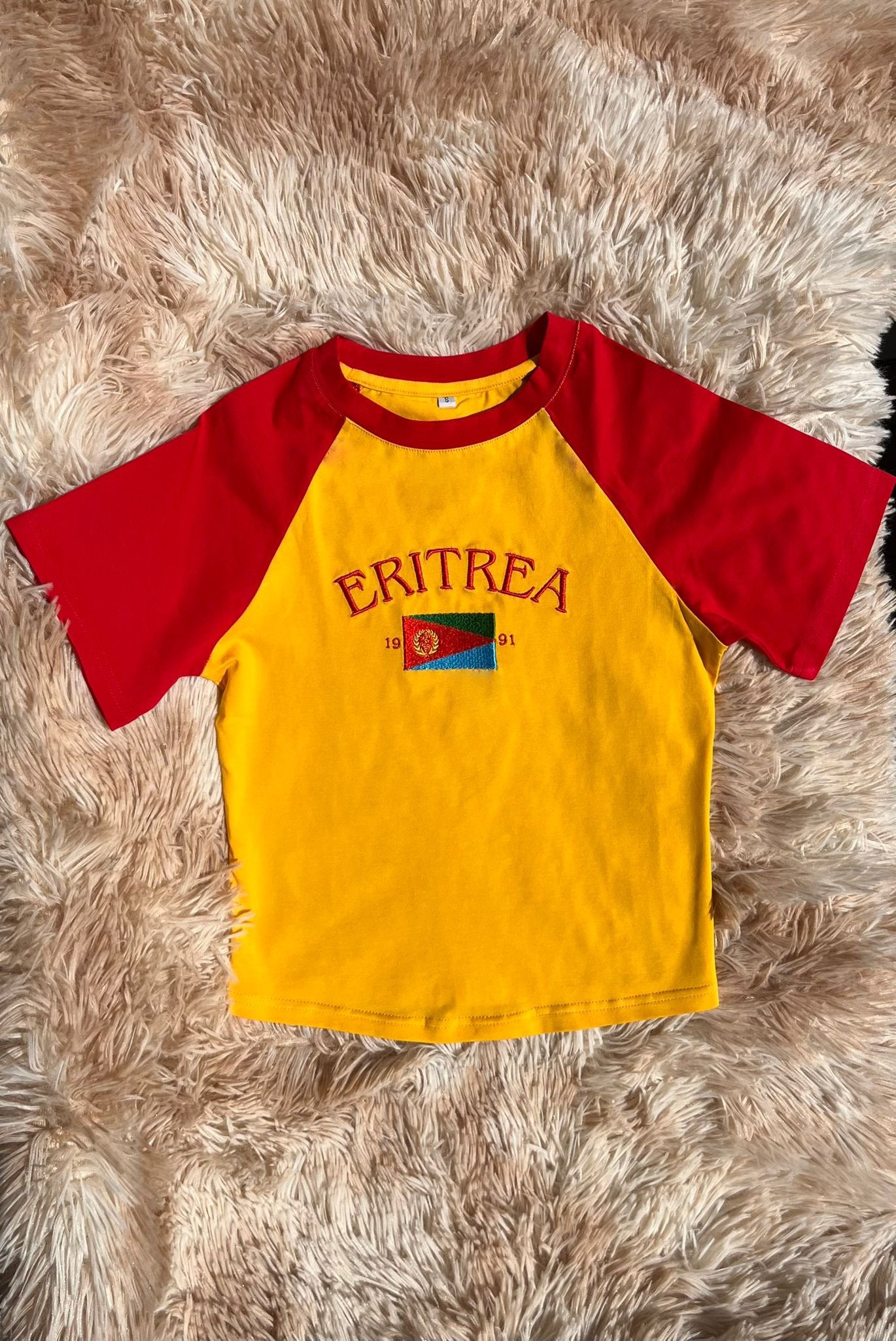 Rayonnez avec notre crop top jaune ቢጫ, pensé pour les femmes qui allient style, histoire et fierté culturelle. Confectionné dans une matière légère et agréable, il se distingue par ses broderies de qualité : l'inscription "ERITREA", l'année "1991" et le drapeau érythréen, tous brodés avec soin pour un rendu durable et sophistiqué.